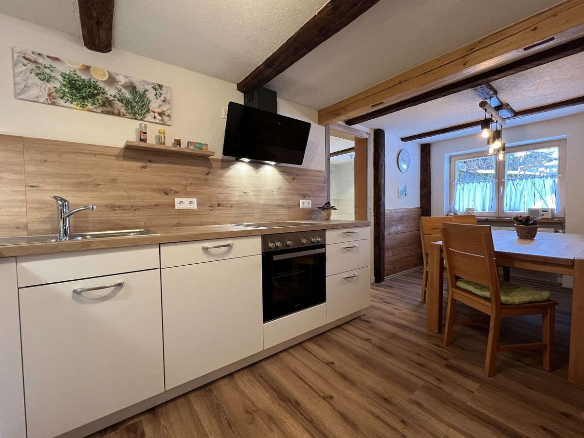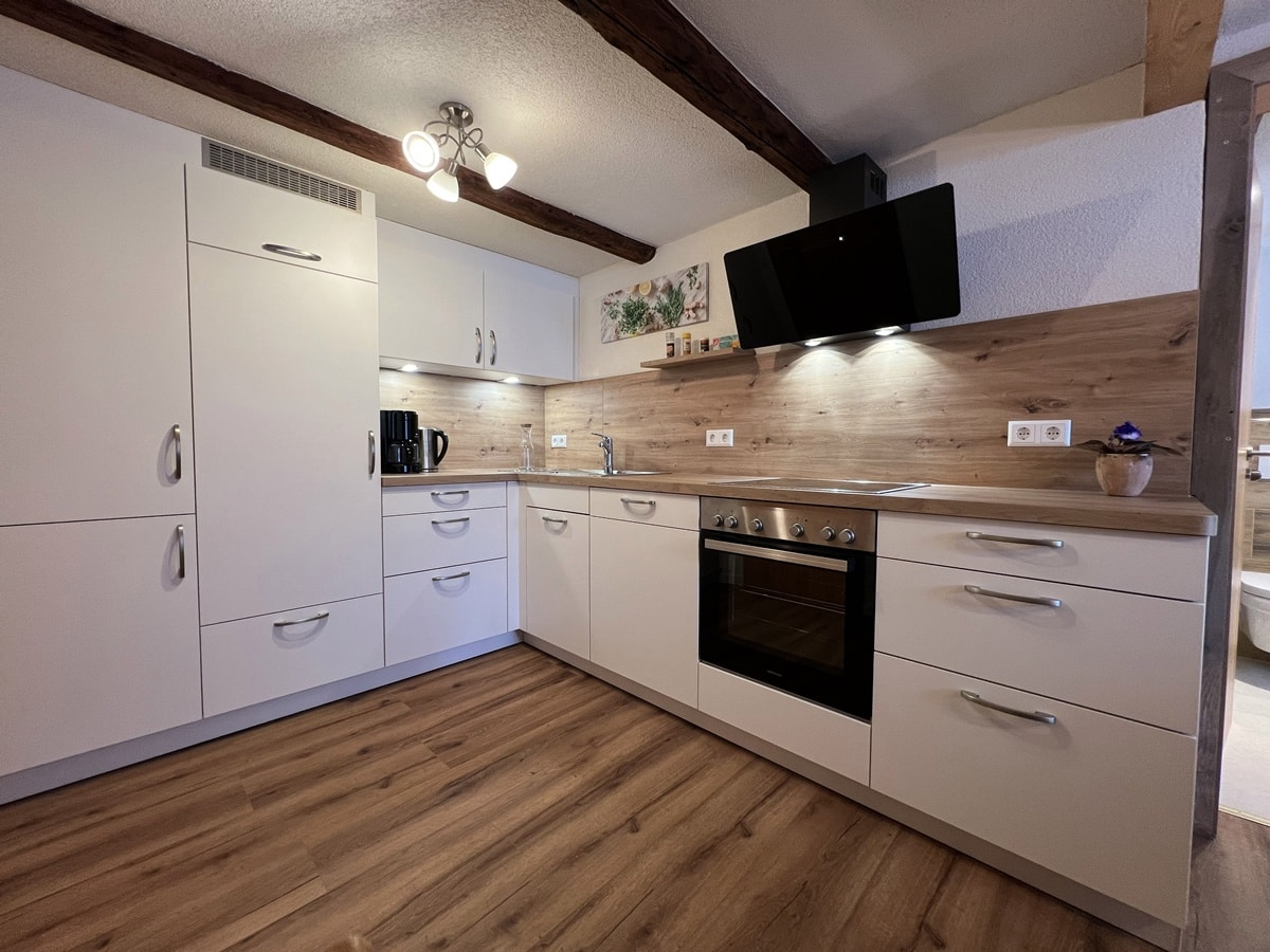 - komplett ausgestattete Küchenzeile mit E-Herd, Backofen, Kühlschrank mit Gefrierfach, Geschirrspüler, Filter-Kaffeemaschine, Wasserkocher, Toaster, Handrührgerät, großzügig Koch- und Essgeschirr,